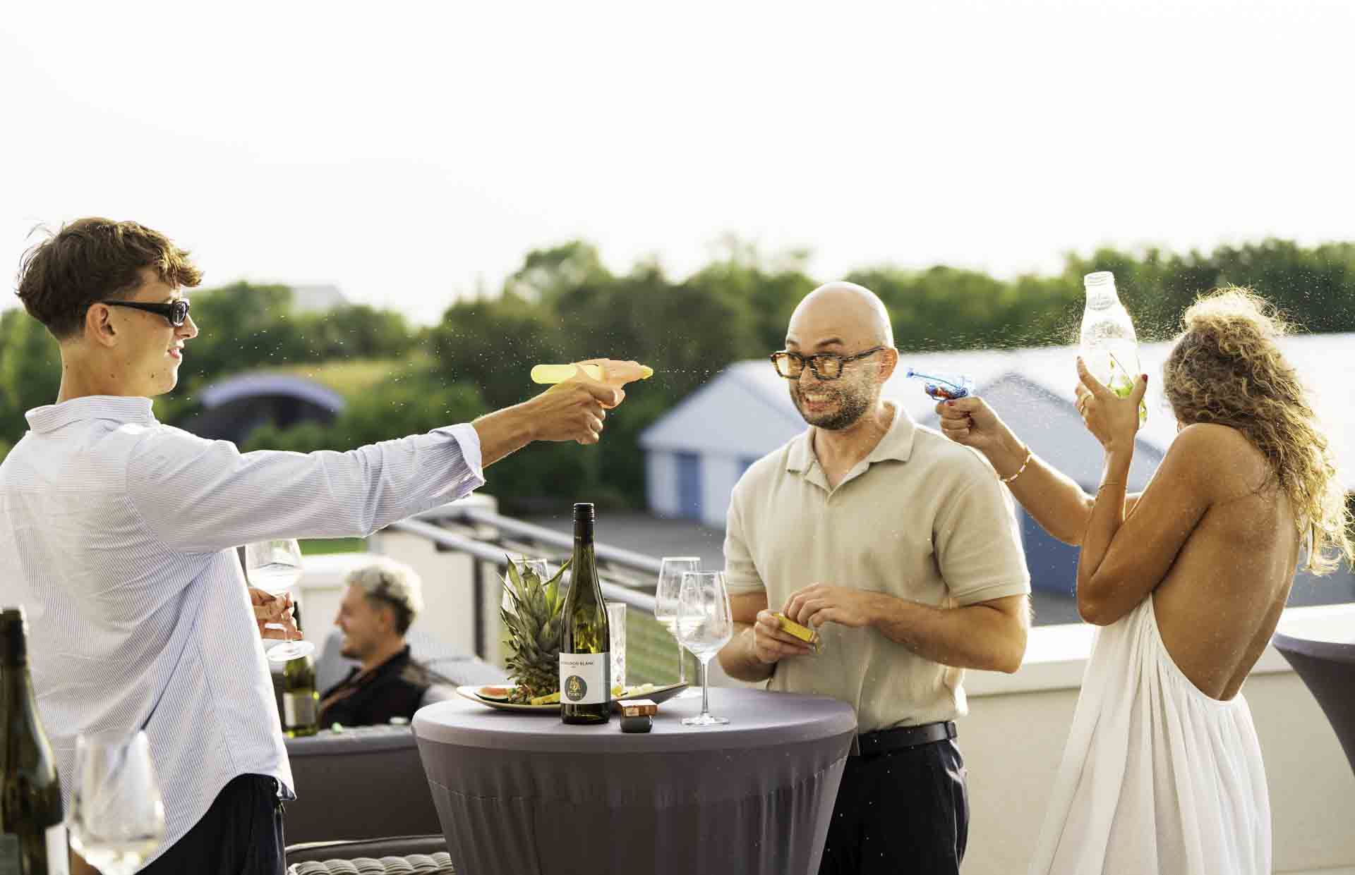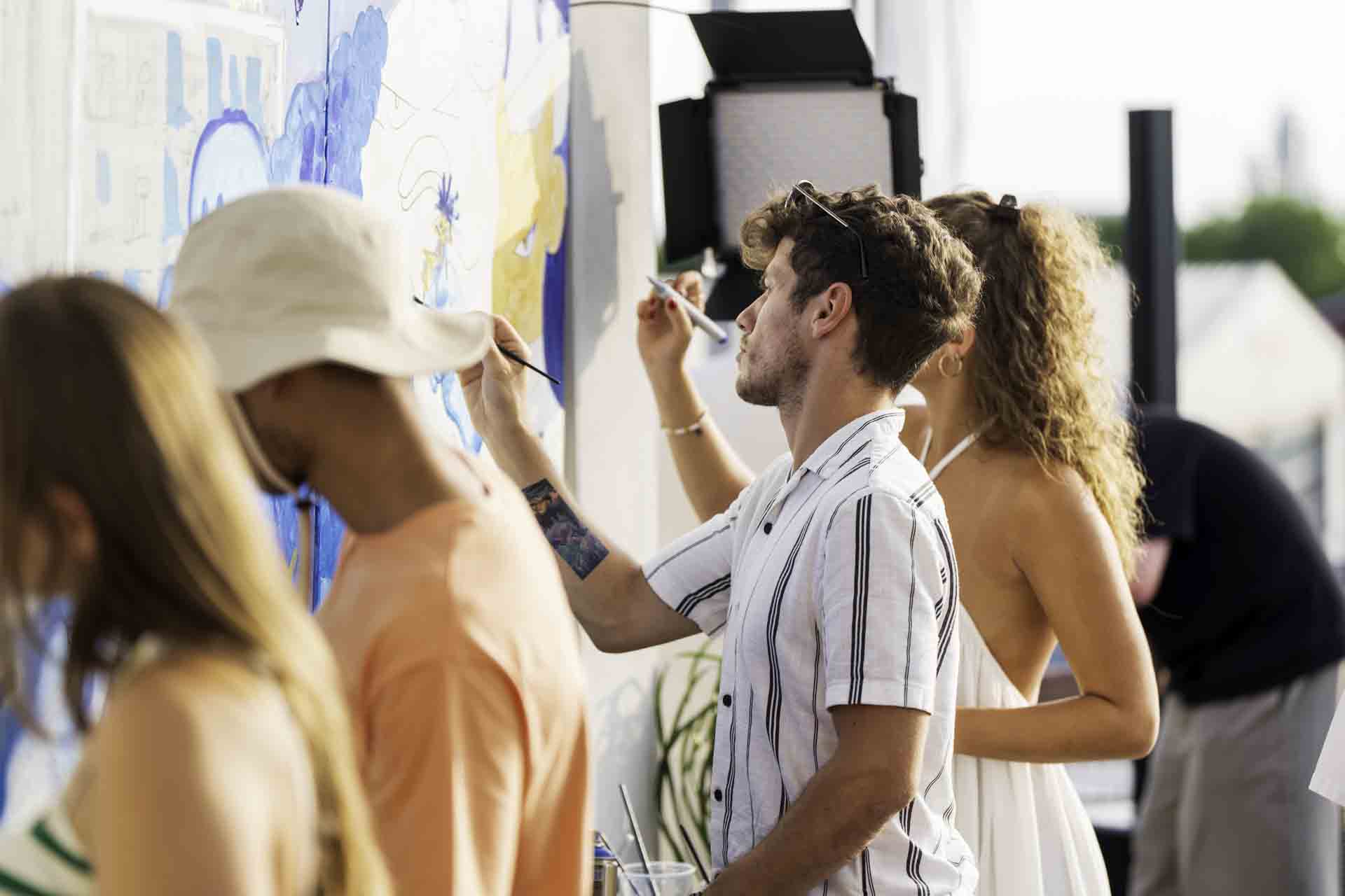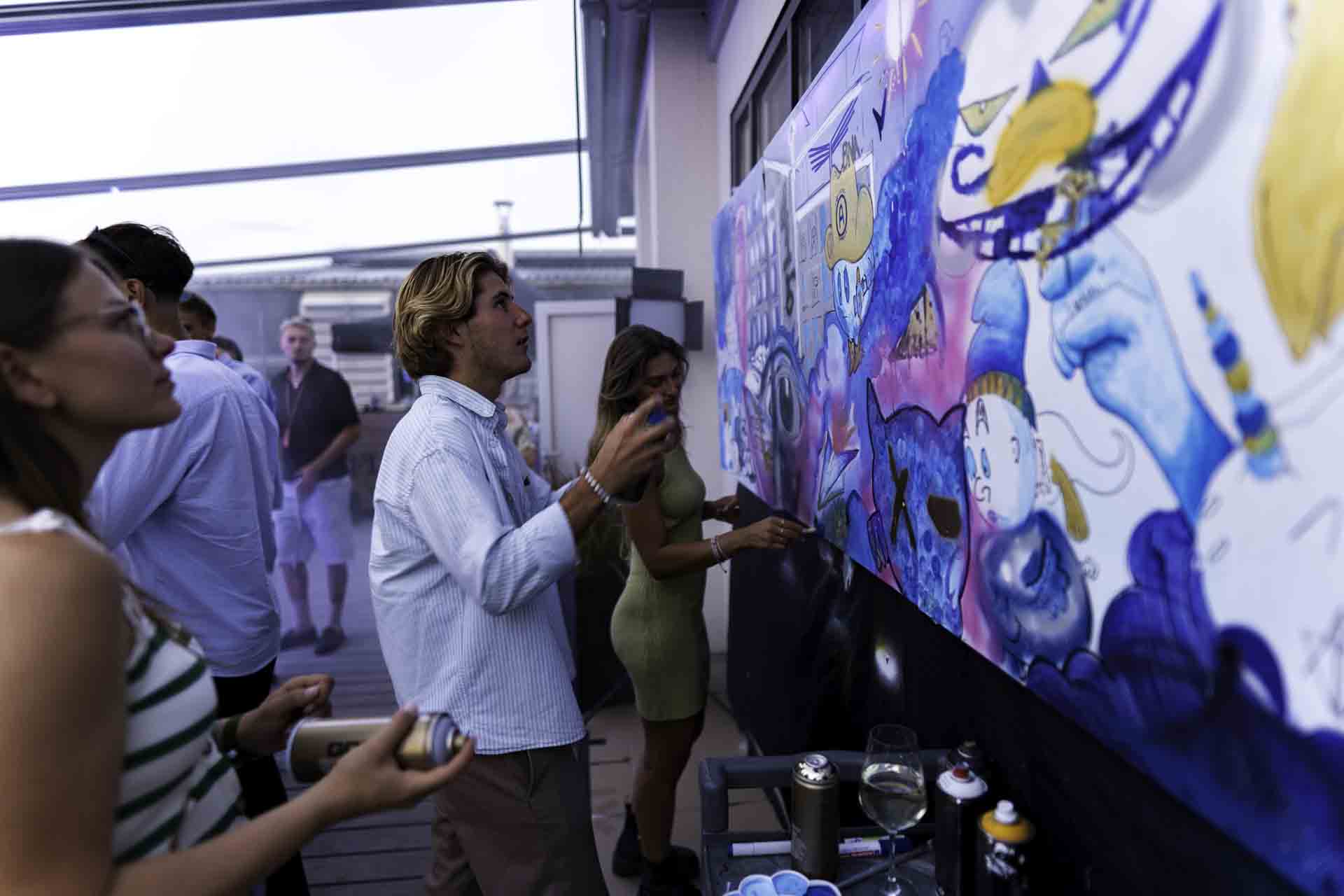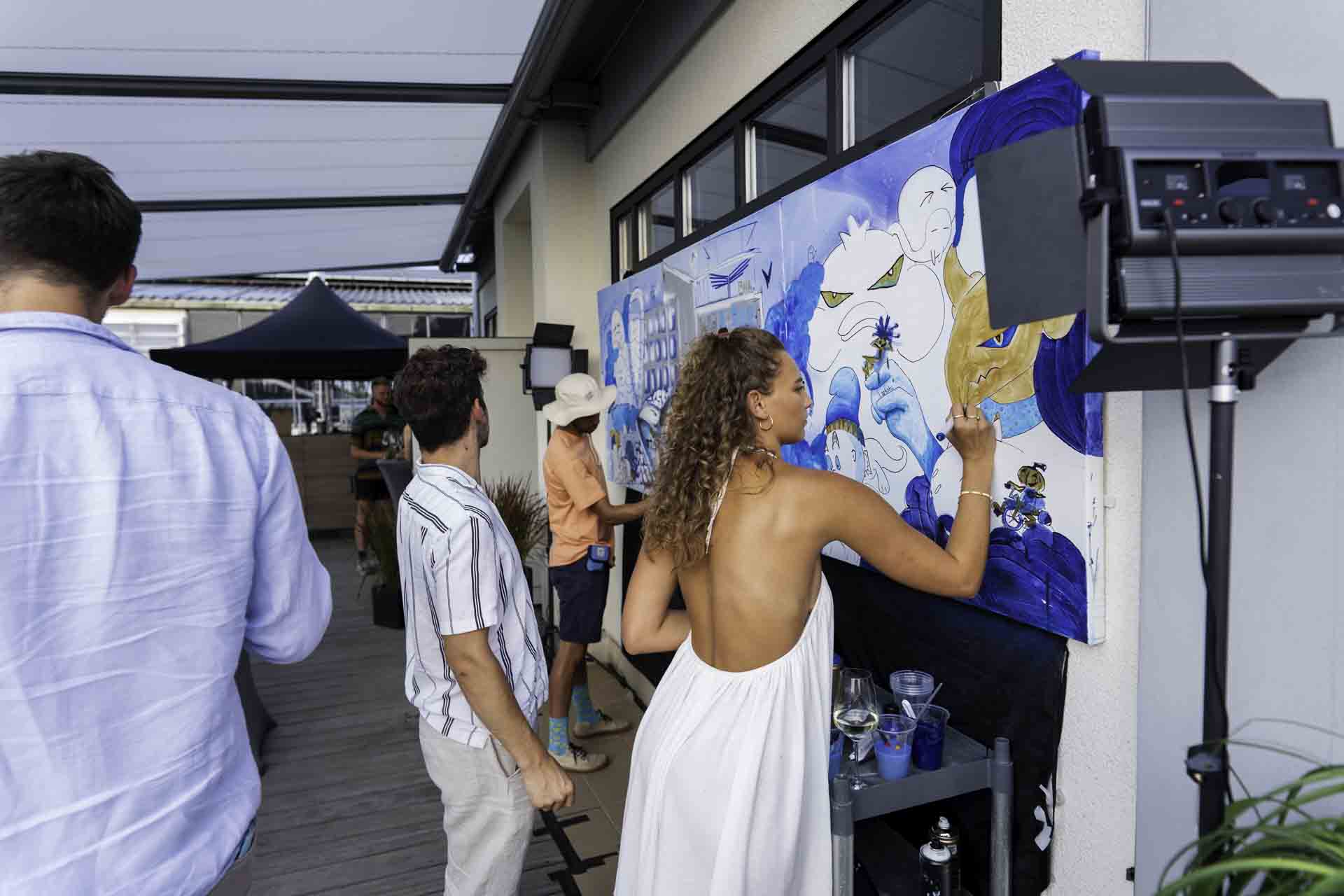 Bei spätsommerlichen Sonnenstrahlen und einem atemberaubenden Blick über die Stadt bot die Flyingbar Fliegerhorst den perfekten Rahmen für eine Rooftop-Kunstparty. Die Gäste ließen sich von der entspannten Sundowner-Stimmung und der außergewöhnlichen Kulisse inspirieren, um gemeinsam Kunstwerke zu erschaffen. Ob in Form von Malerei, Skizzen oder anderen kreativen Techniken – die Rooftop-Atmosphäre verlieh dem künstlerischen Prozess eine besondere Magie. Der Mix aus entspannter Sommerstimmung und kreativer Energie machte diese Veranstaltung zu einem Highlight des Kunstsommers.